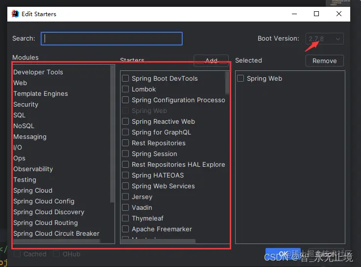 2.3.2 选择同父级的springboot版本,然后选择需要依赖。
