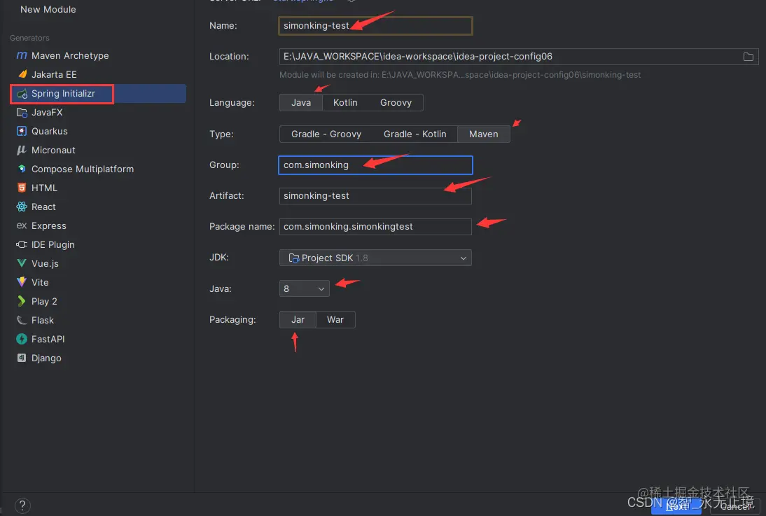 因为Springboot项目的Packaging 没有pom的选项,这里可以直接使用默认的jar,创建完成之后修改成pom即可。