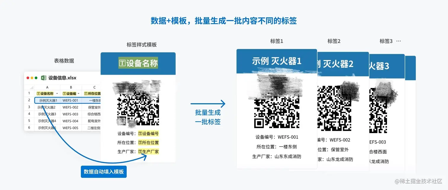 只需选择标签模板,上传Excel或在线表格填入数据,便可批量生成一批样式结构一致,内容不同的标签。