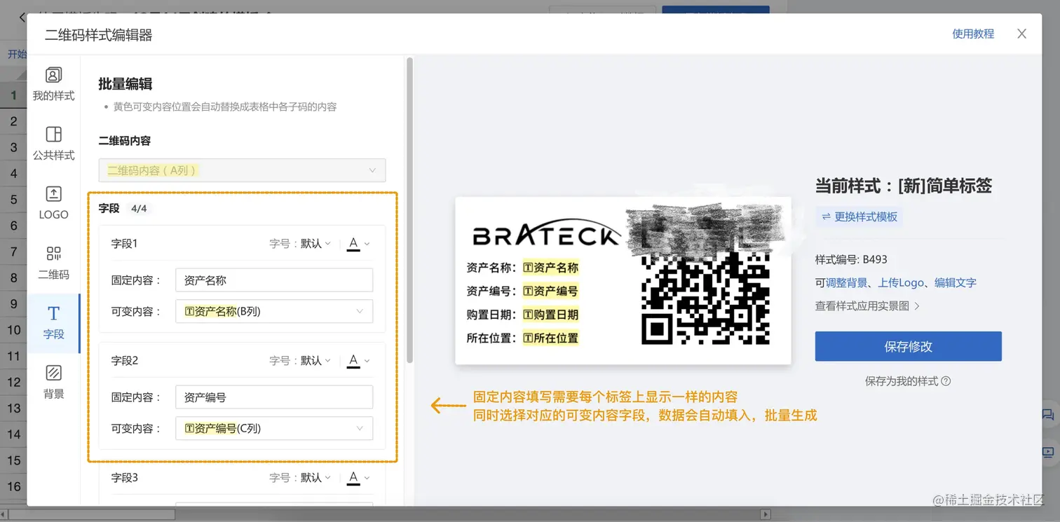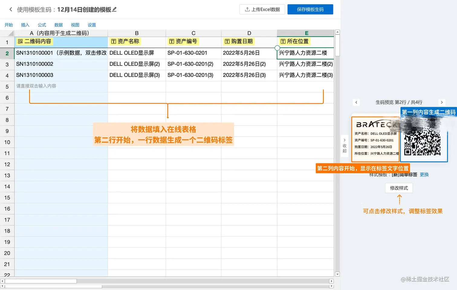 如果已有多个数据,可直接上传本地Excel或使用在线表格填入数据,第一列数据将用于生成二维码(即扫码展示的内容) ,其他列的内容可设置为标签上显示的字段。可点击修改样式,调整显示的标签效果。
