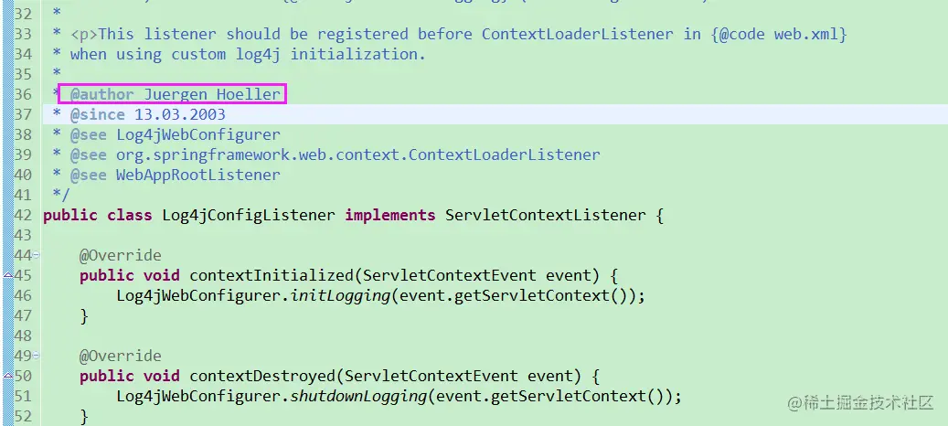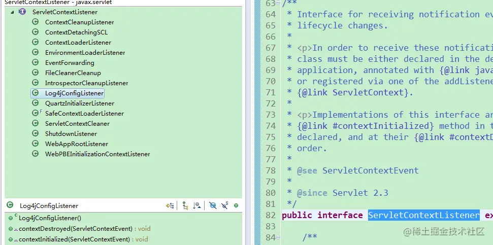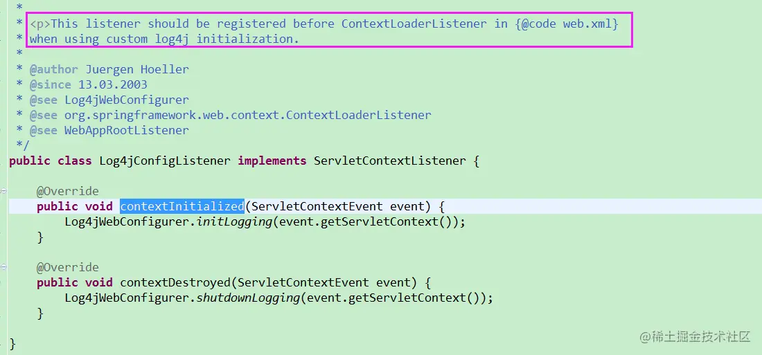 但是我们可以看到log4j的监听器,我们不妨先看一下log4j的初始化过程,进入*contextInitialized()*方法,我们可以看到: