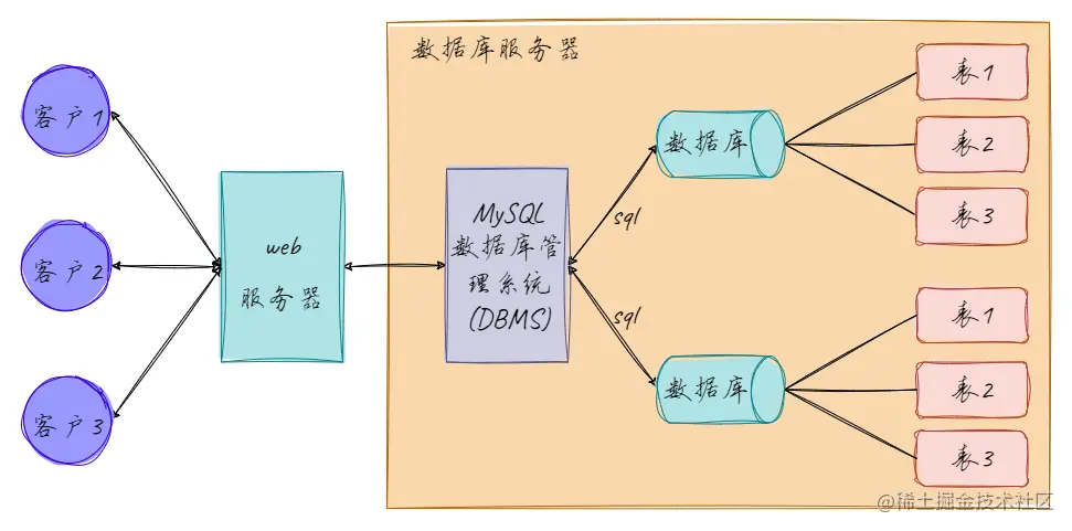 数据库管理系统可以管理多个数据库,一般开发人员会针对每一个应用创建一个数据库,为保存应用中实体的数据,一般会在数据库创建多个表,以保存程序中实体用户的数据。