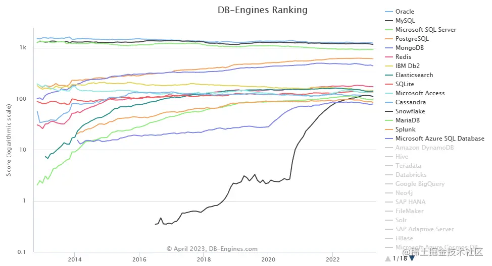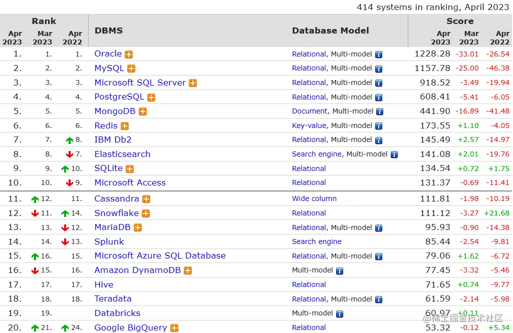从排名中可以看出来,关系型数据库绝对是DBMS的主流,其中使用最多的DBMS分别是Oracle、MySQL和SQL Server,这些都是关系型数据库(RDBMS)。