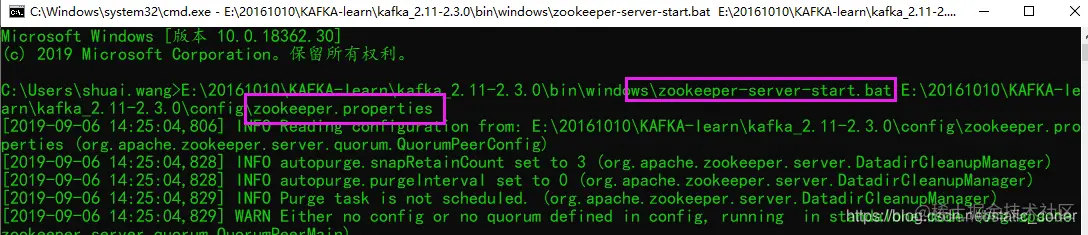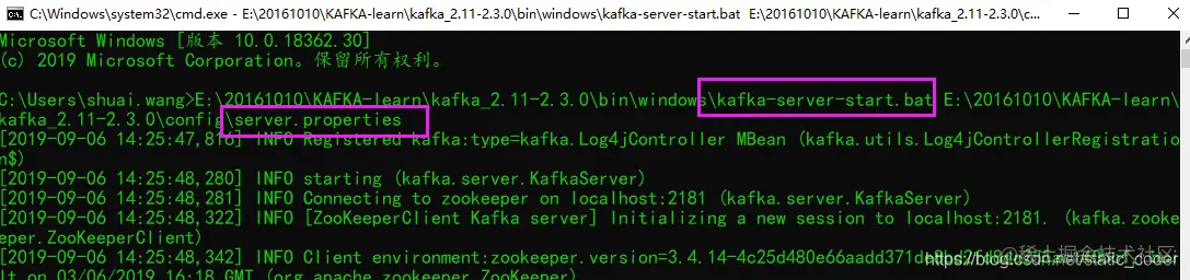 Kafka是基于Zookeeper的,Kafka2.3.0包中集成了Zookeeper,可以直接使用。先启动zk,后启动Kafka,如图: