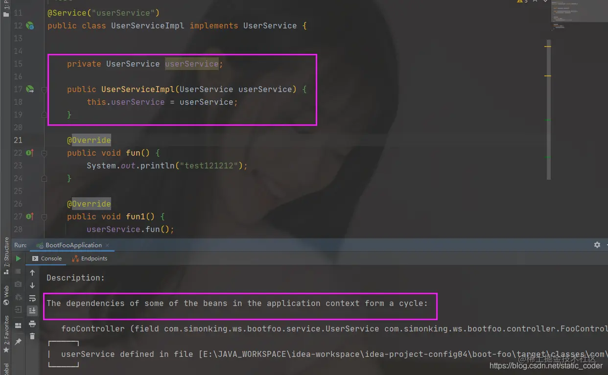 但是如果使用构造函数注入的话,就是是死循环,如图: