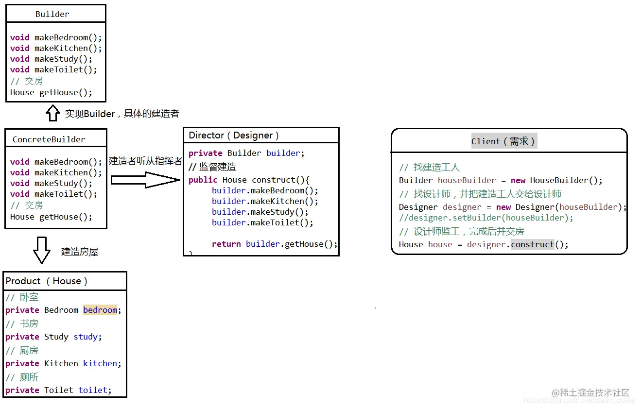 房主找来设计师(Director)和建造者(ConcreteBuilder),完成一个房子(Product)的建造。