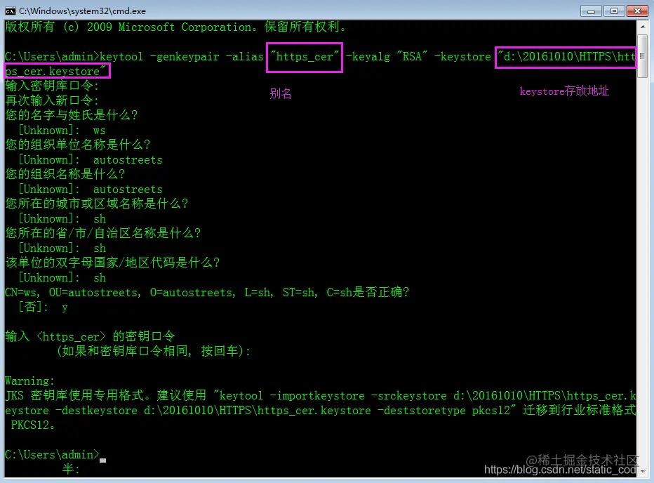 keytool -genkeypair -alias "https_cer" -keyalg "RSA" -keystore "d:\20161010\HTTPS\https_cer.keystore"