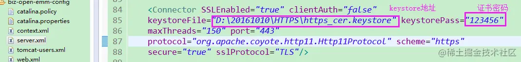 <Connector SSLEnabled="true" clientAuth="false" keystoreFile="d:\20161010\HTTPS\https_cer.keystore" keystorePass="testtest1" maxThreads="150" port="443" protocol="org.apache.coyote.http11.Http11Protocol" scheme="https" secure="true" sslProtocol="TLS"/>