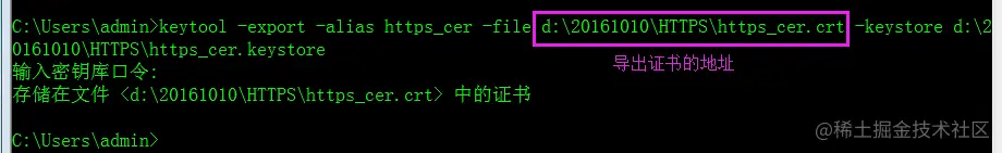 keytool -export -alias https_cer -file d:\20161010\HTTPS\https_cer.crt -keystore d:\20161010\HTTPS\https_cer.keystore