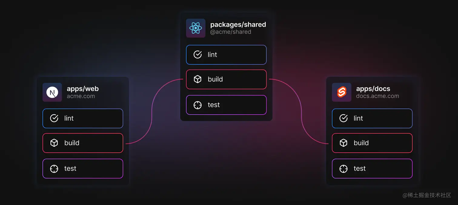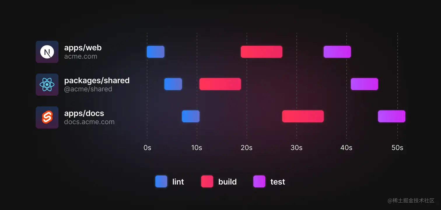 Turbo 接管工作区 package.json 中声明的脚本任务,并通过声明任务之间的依赖关系,并行执行任务。