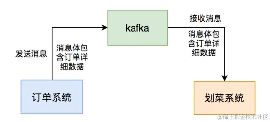 刚开始我们系统的商户很少,为了快速实现功能,我们没想太多。既然是走消息中间件 kafka通信,订单系统发消息时将订单详细数据放在消息体,我们后厨显示系统只要订阅 topic ,就能获取相关消息数据,然后处理自己的业务即可。