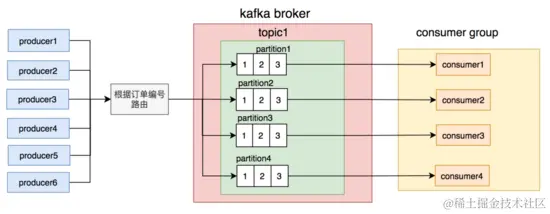 调整后按 订单号 路由到不同的 partition ,同一个订单号的消息,每次到发到同一个 partition 。