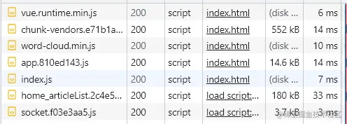 如图,当第一次进入的时候只会加载到home.xx.js,当进入另一个路由的时候就会去加载对应组件,如图中的socket.xx.js