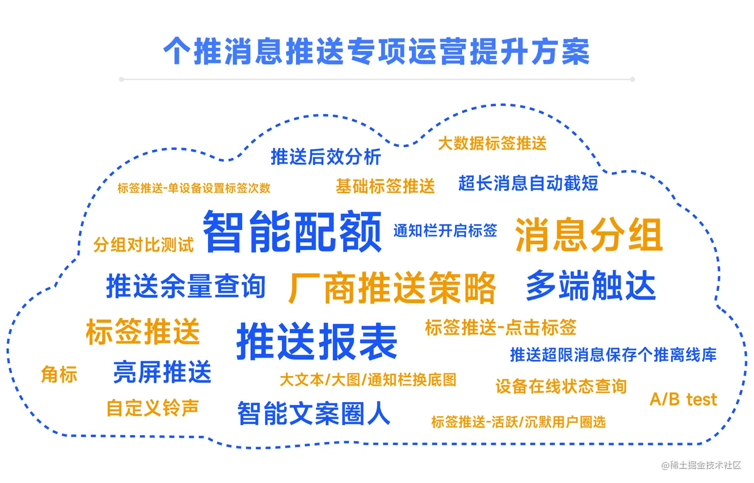 比如APP运营人员可以对用户属性、设备状态、设备使用场景等维度综合分析,预测出最佳的用户触达时机,实现**“亮屏推送”,在“合适的时间”“合适的场景”下完成消息下发,提升消息到达率和点击率;运营人员也可以结合用户的行为特征,实现“智能配额”**,在保障消息到达的同时节约厂商额度,实现在用户触达场景中的“降本增效”。