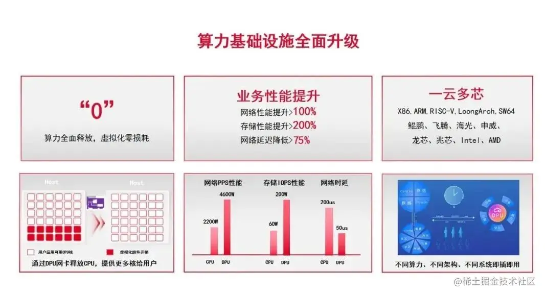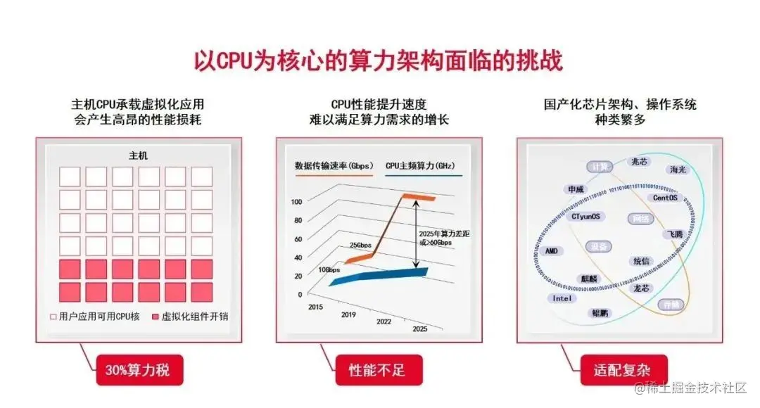 CPU和内存资源,带来巨大的算力消耗,形成高额的算力税。然而即便如此,基于CPU通用计算能力、以纯软件来实现的虚拟化组件,整体性能仍无法满足客户日益增长的数据处理需求。且国产化芯片架构、操作系统种类繁多,复杂的适配工作会耗费大量的人力和时间成本,新型高性能计算架构势在必行。