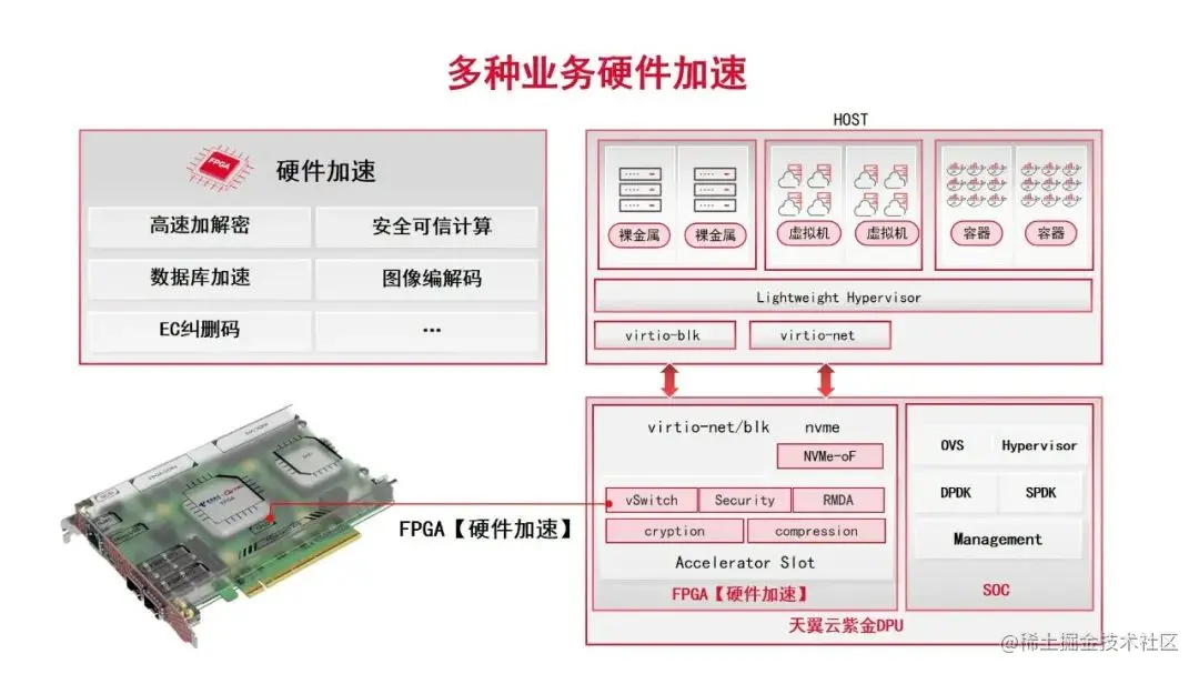 天翼云紫金DPU采用SOC+FPGA架构,依托FPGA强大的处理性能和灵活的可编程能力,对多种应用进行加速。