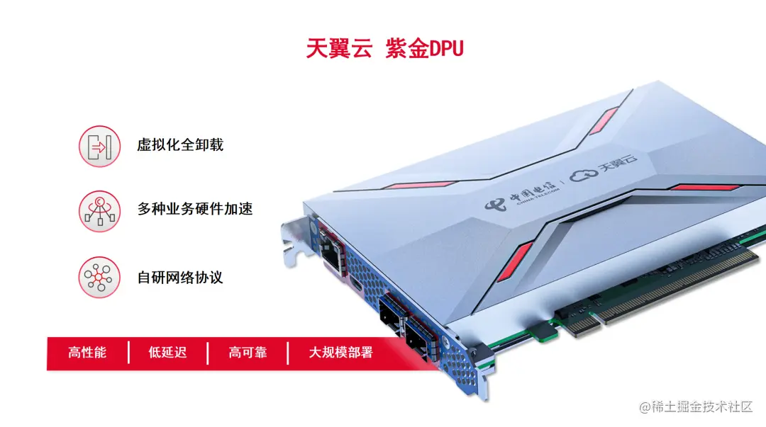 天翼云作为云服务国家队,积极应对算力挑战,自研紫金DPU,通过虚拟化组件卸载、多种业务硬件加速以及自研三栈合一高性能网络协议,打造高性能、低延时、高可靠性并且可大规模部署的环境,助力算力基础设施升级。