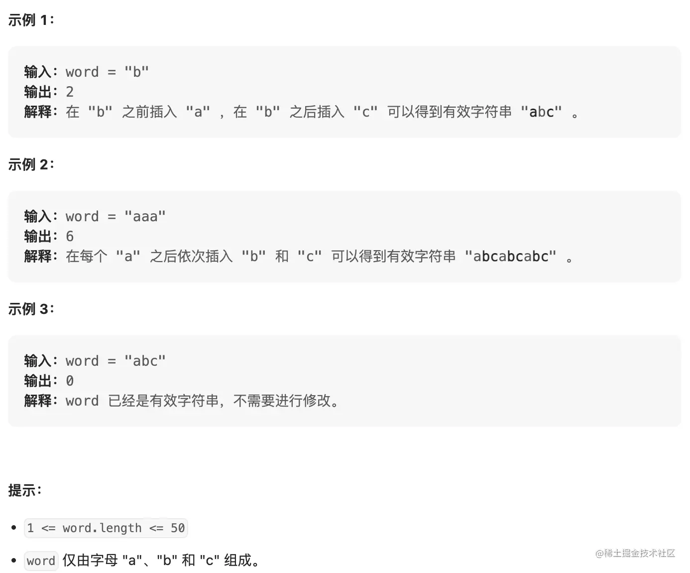 给你一个字符串 word ,你可以向其中任何位置插入 "a"、"b" 或 "c" 任意次,返回使 word 有效 需要插入的最少字母数。