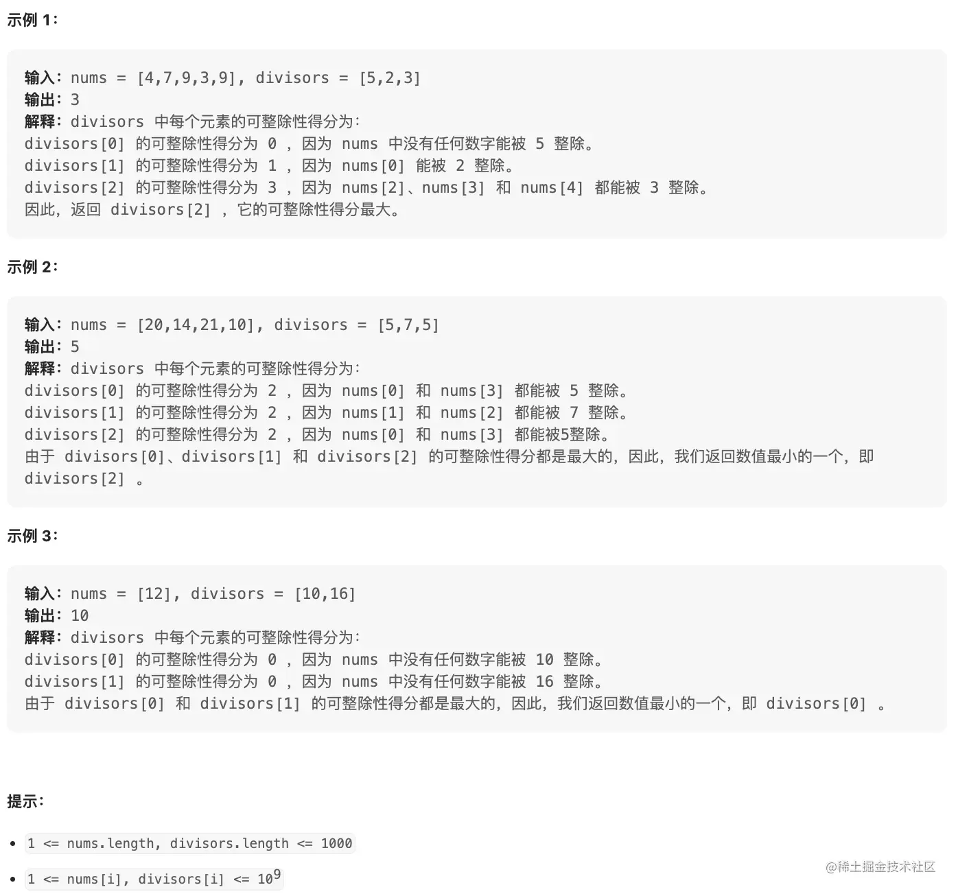 divisors[i] 的 可整除性得分 等于满足 nums[j] 能被 divisors[i] 整除的下标 j 的数量。