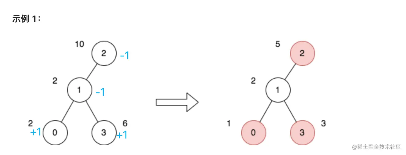 那怎么计算访问次数呢?跟差分数组一样,对差分数组计算前缀和就可以获得节点的访问次数,我们在归的过程中累加差分值,例如 节点 1 的访问次数就是 +1 + 1 - 1 等于 1 次。