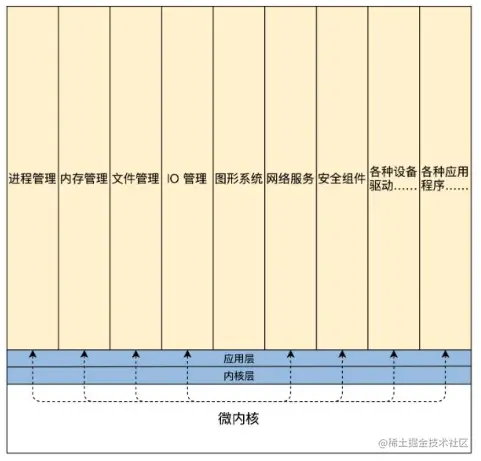 特点:功能耦合,效率高;但是开发一个新的功能也得重新编译、链接、安装内核,因为它没有模块化,没有扩展性、没有移植性,高度耦合在一起,一旦其中一个组件有漏洞,内核中所有的组件可能都会出问题。