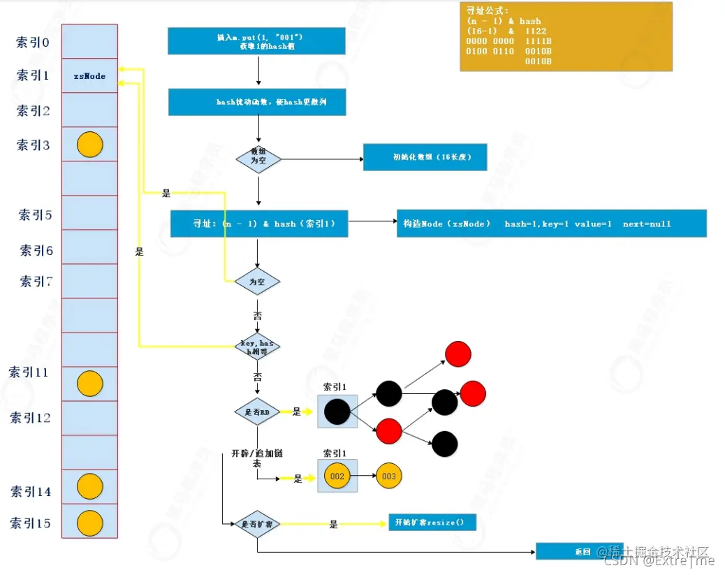 if ((p = tab[i = (n - 1) & hash]) == null)//寻址:(n - 1) & hash重要,16-1 按位与hash,为null表示没有值