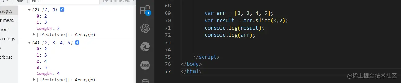 slice方法:也是用来截取数组的与splice最大的不同点是在于,该方法不会影响原数组;且会将截取的部分以新数组的方式返回给我们。