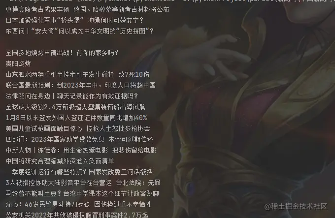 我们这里会得到一个所有新闻的标题列表,我们for遍历一下。我们看看效果。