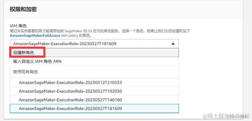 对于权限和加密,点击角色下拉框,然后点击 创建新角色