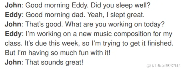 在这个家庭中,John Lin 早上七点第一个起床,然后刷牙、洗澡、穿衣服、吃早餐,接着在客厅的餐桌旁浏览新闻。早上 8 点,John Lin 的儿子 Eddy 也跟着起床准备上课。他临出门时和 John 进行对话,内容为: