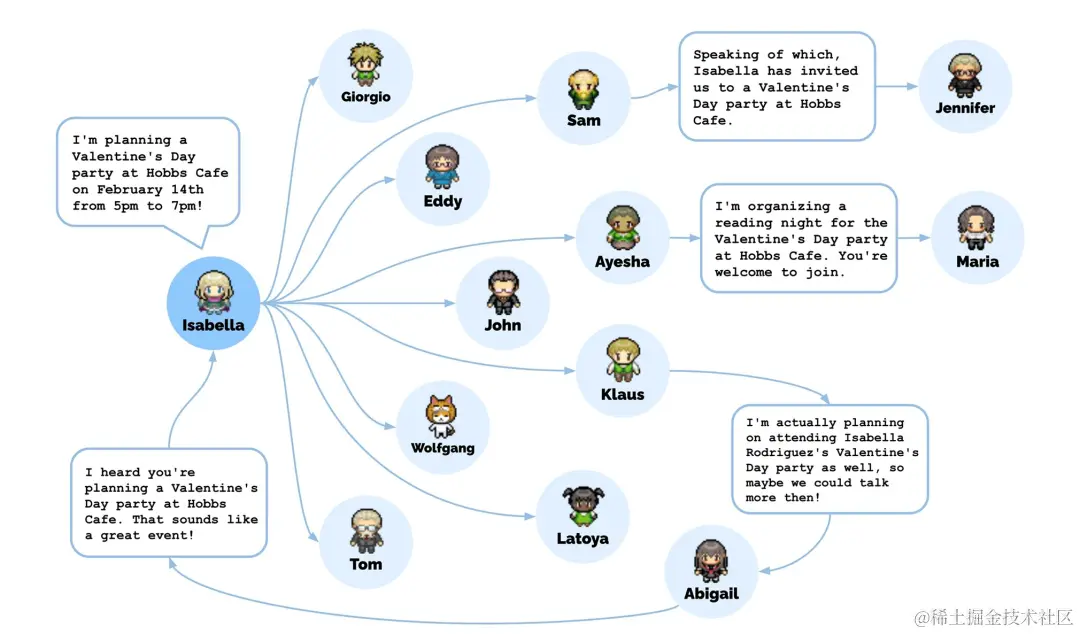 比如,伊莎贝拉计划举办一场情人节派对。她传播了这个信息,在模拟结束时,12 个角色已经知道了这件事。其中 7 个人「犹豫不决」——3 个人已有其他计划,4 个人没有表露想法,这和人类的相处一样。
