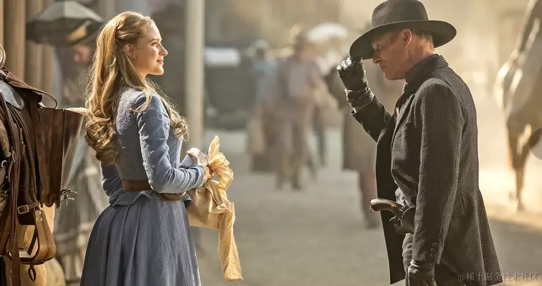 《西部世界》剧照,左边人物为预装了故事情节的机器人。