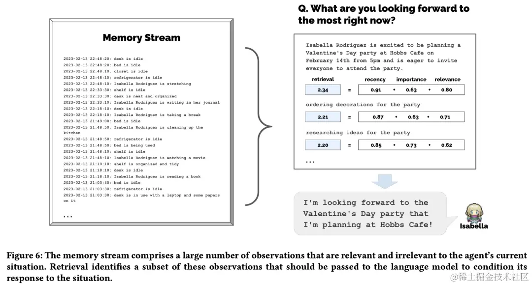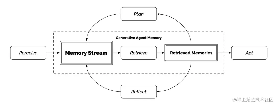 由于 Generative Agents 会产生大量必须保留的事件和记忆流(memory stream),因此其架构的核心挑战是确保在需要时检索和合成智能体记忆中最相关的部分。