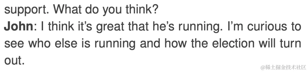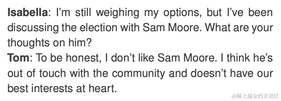 智能体之间用自然语言进行交流,假如智能体意识到在其周围有其他智能体,它们会思考要不要走过去进行聊天。例如 Isabella Rodriguez 和 Tom Moreno 就即将到来的选举进行了对话: