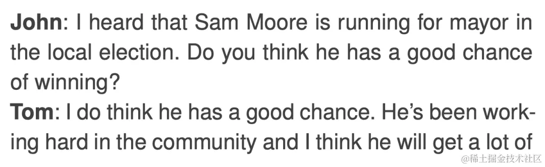 当天晚些时候,在 Sam 离开后,从另一个渠道听到消息的 Tom 和 John 讨论了 Sam 赢得选举的机会: