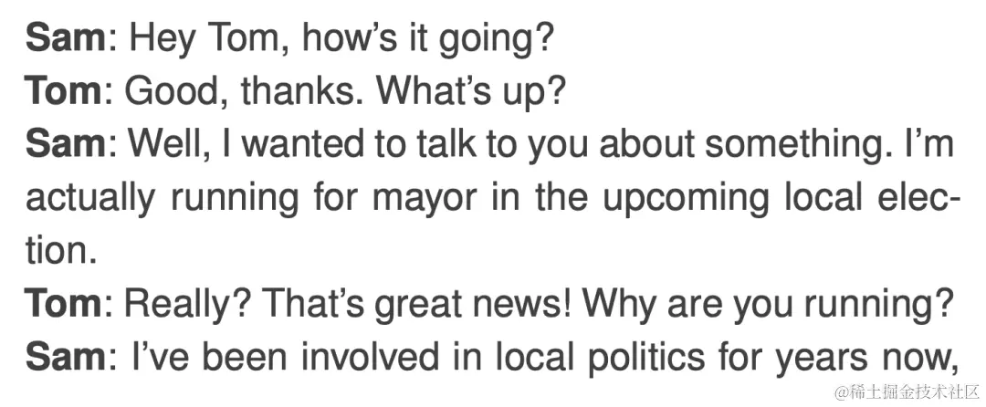 信息传播。当智能体注意到对方,它们可能会进行对话。当这样做时,信息可以从智能体传播到另一智能体。例如,在 Sam 和 Tom 在杂货店的对话中,Sam 告诉了 Tom 他在当地选举中的候选资格: