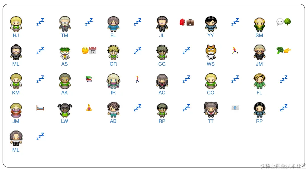 在沙盒的每个 step 内,智能体都输出一个自然语言语句,以描述它们当前的动作,例如语句「Isabella Rodriguez 正在写日记」、「Isabella Rodriguez 正在查看邮件」等。然后这些自然语言被转化为影响沙盒世界的具体动作。动作以一组表情符号的形式显示在沙盒界面上,这些表情符号提供了动作的抽象表征。