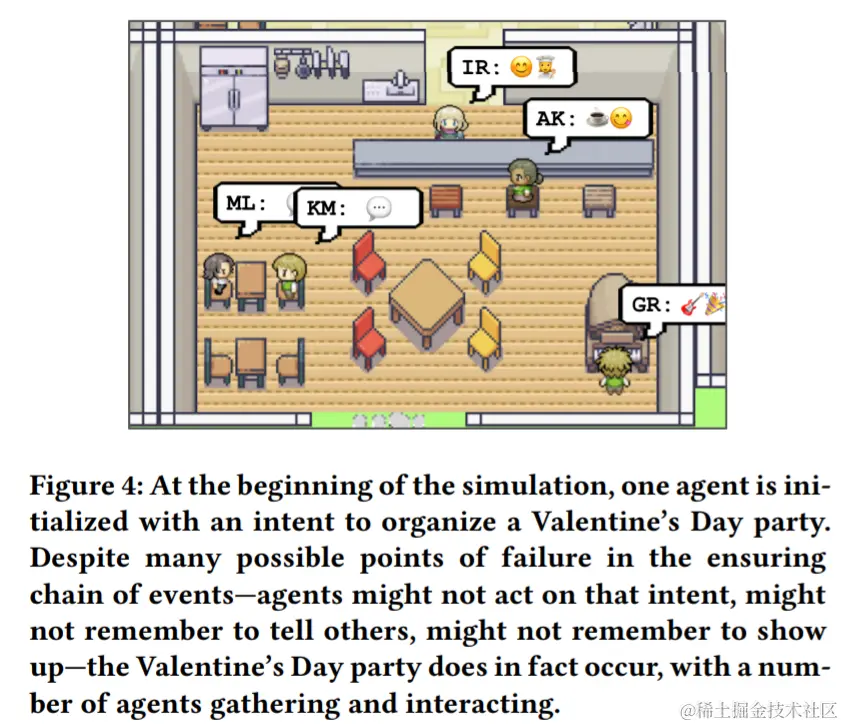 情人节那天,包括 Klaus 和 Maria 在内的五名智能体在下午 5 点出现在 Hobbs 咖啡馆,它们享受着庆祝活动(图 4)。在这个场景中,终端用户只设置了 Isabella 举办派对的初始意图和 Maria 对 Klaus 的迷恋:传播信息、装饰、约对方、到达派对以及在派对上互动的社交行为 ,由智能体架构发起。
