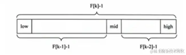 斐波那契查找原理与前两种相似,仅仅改变了中间结点(mid)的位置,mid不再是中间或插值得到,而是位于黄金分割点附近,即mid=low+F(k-1)-1(F代表斐波那契数列),如下图所示