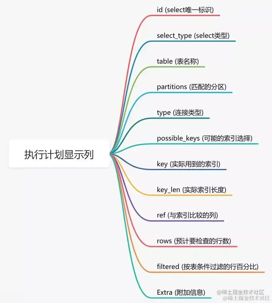 通过这几列可以判断索引使用情况,执行计划包含列的含义如下图所示: