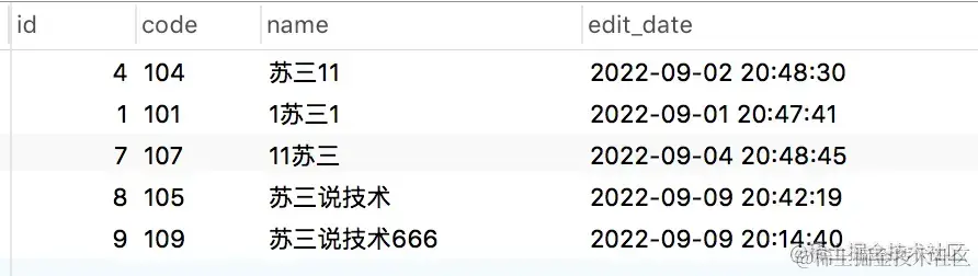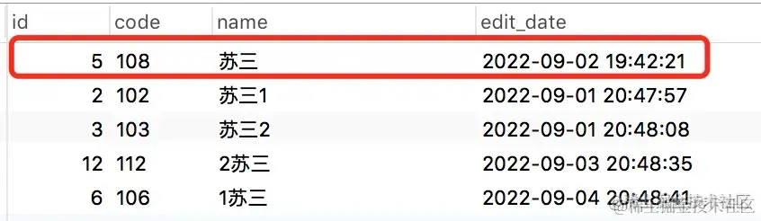 VALUES (5, '108', '苏三', '2022-09-02 19:42:21');