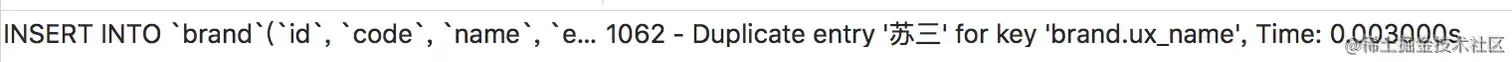肯定不行,因为brand表的name字段创建了唯一索引,同时该表中已经有一条name等于苏三的数据了。
