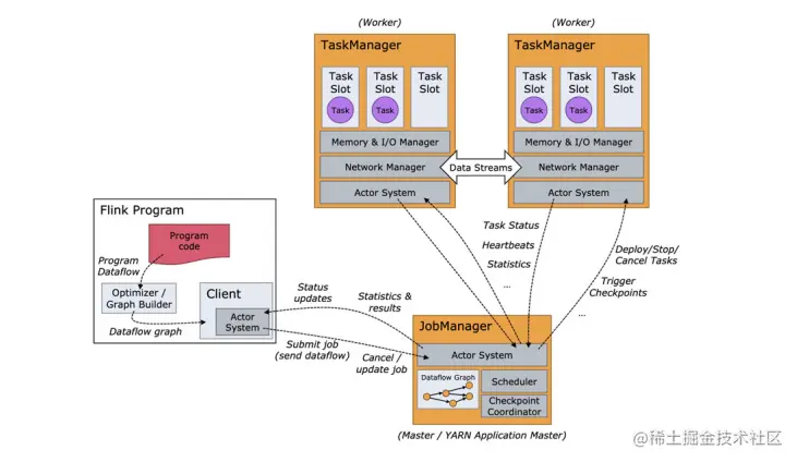 Flink 程序在运行时主要有 TaskManager,JobManager,Client三种角色。其中JobManager扮演着集群中的管理者Master的角色,它是整个集群的协调者,负责接收Flink Job,协调检查点,Failover 故障恢复等,同时管理Flink集群中从节点TaskManager。TaskManager是实际负责执行计算的Worker,在其上执行Flink Job的一组Task,每个TaskManager负责管理其所在节点上的资源信息,如内存、磁盘、网络,在启动的时候将资源的状态向JobManager汇报。Client是Flink程序提交的客户端,当用户提交一个Flink程序时,会首先创建一个Client,该Client首先会对用户提交的Flink程序进行预处理,并提交到Flink集群中处理,所以Client需要从用户提交的Flink程序配置中获取JobManager的地址,并建立到JobManager的连接,将Flink Job提交给JobManager。