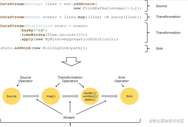 上图是来自Flink官网的运行流程图。通过上图我们可以得知,Flink 程序的基本构建是数据输入来自一个 Source,Source 代表数据的输入端,经过 Transformation 进行转换,然后在一个或者多个Sink接收器中结束。数据流(stream)就是一组永远不会停止的数据记录流,而转换(transformation)是将一个或多个流作为输入,并生成一个或多个输出流的操作。执行时,Flink程序映射到 streaming dataflows,由流(streams)和转换操作