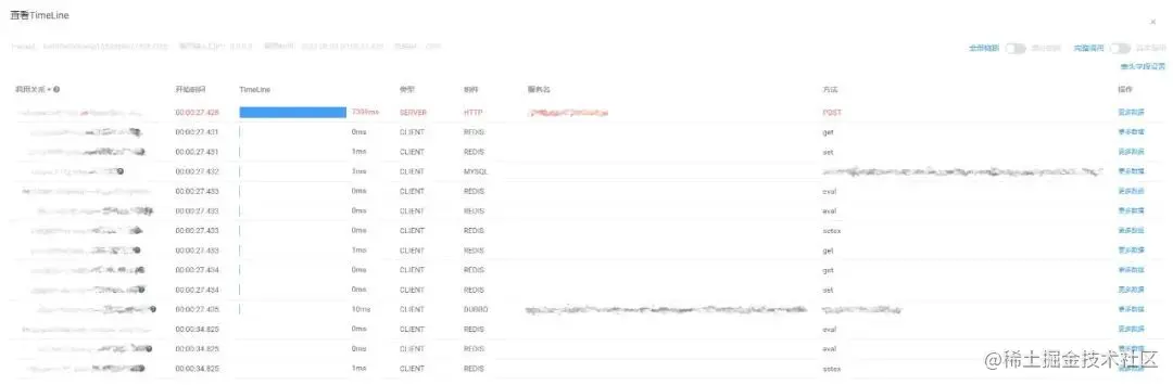 首先到公司的应用监控平台上,筛选出0点前后5min的调用链列表,然后按照链路耗时逆序排列,发现最大接口耗时7399ms。查看调用链详情,发现下游依赖耗时都是ms级别。调用链因为是抽样采集,可能存在链路信息丢失的情况,因此需要其他手段进一步排查下游依赖服务。