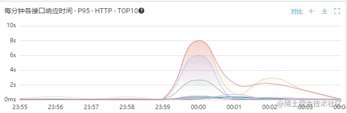 首先通过公司的应用监控系统查看了0点前后每分钟各接口的P95响应时间。如下图所示,接口响应时间在0点时刻最高达到了8s。继续查看锁定耗时最高的接口为商品列表接口,下面就针对这个接口展开具体的排查。