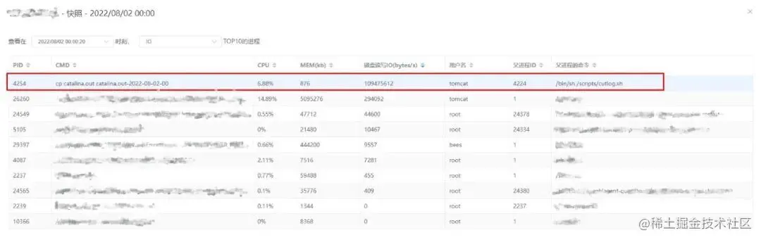 发现在00:00:20时刻,tomcat用户在执行脚本/bin/sh /scripts/cutlog.sh,脚本在执行命令cp catalina.out catalina.out-2022-08-02-00。IO消耗达到了109475612 bytes/s(约104MB/s) 。