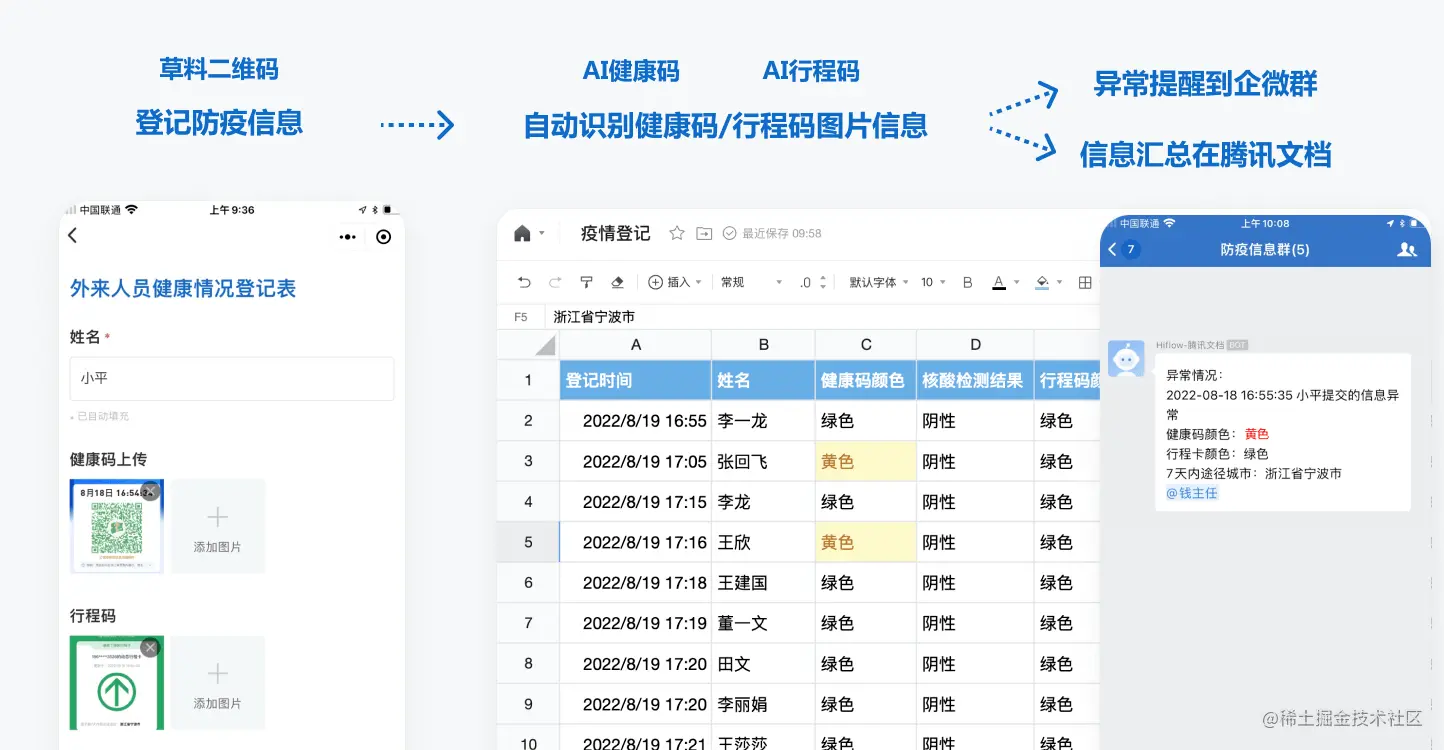 新员工登记、健康码图片自动识别、劳务人员上报银行卡等。