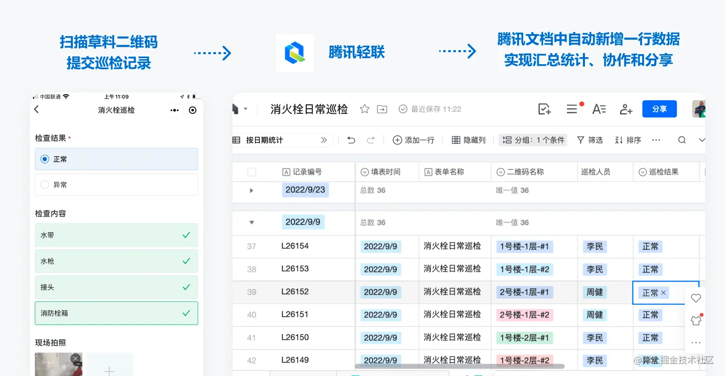 保洁阿姨扫码记录打扫前后的照片,并由保洁主管对上传的照片进行人工审核。同时在打扫中保洁阿姨需检查房间的使用情况,出现维修的情况时要及时上报。这些数据同步到腾讯文档后,进行汇总分析,实现保洁工时计算、物资使用统计、补房卡进度、维修统计等。