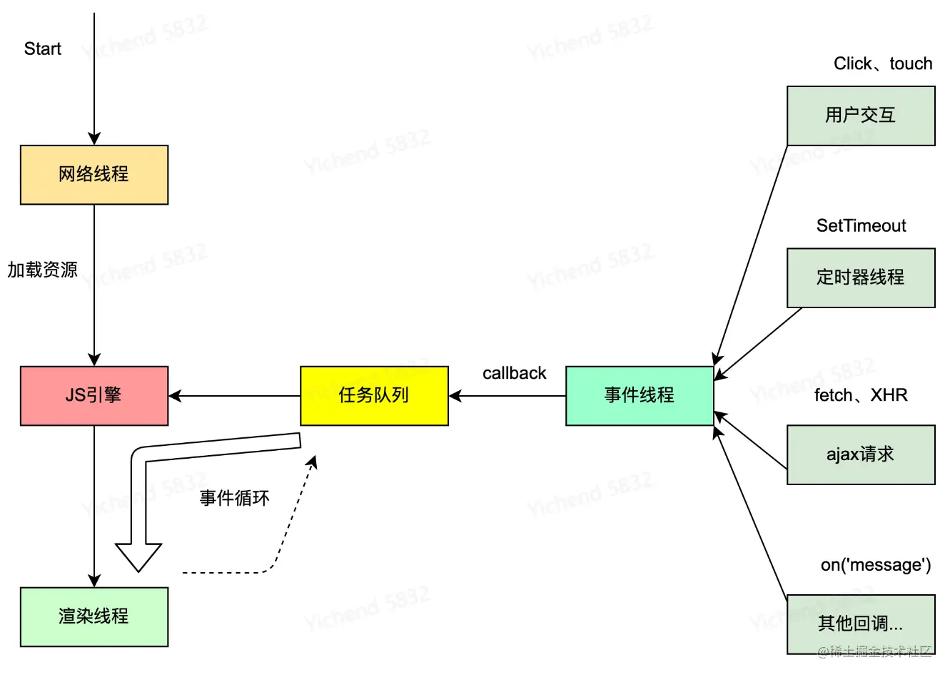 | 网络线程 | 在 XHR、Fetch 等发起请求后新开一个网络线程请求,如果设置了回调函数,在状态变更时,将回调放入事件队列,等待 js 引擎执行 |